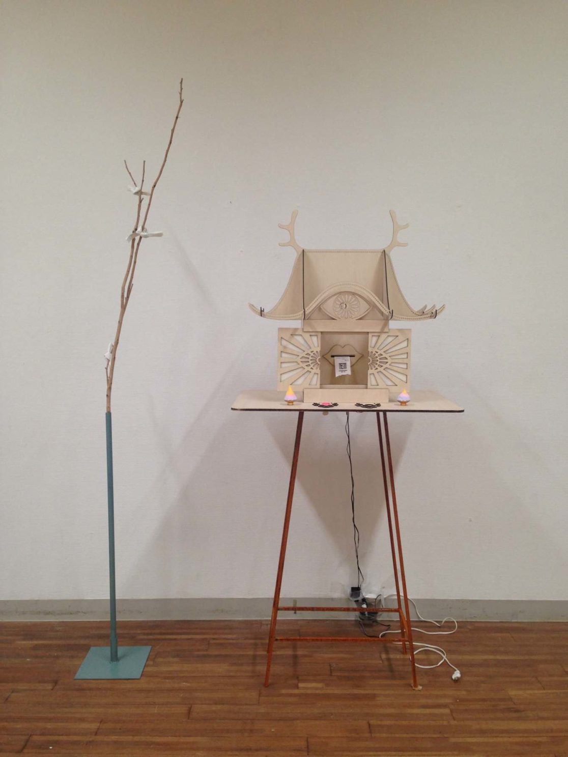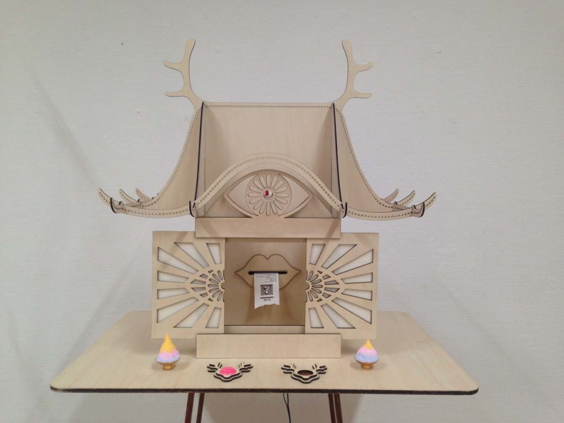 This little shrine, jap. hokora is inhabited by the Space Bambi deity, which enacts as an Arduino programmed fortune telling robot. It includes a touch sensor, thermal sensor, biofeedback and a thermal printer. The hokora is made out of laser cut shiba wood and salted rusty iron legs.