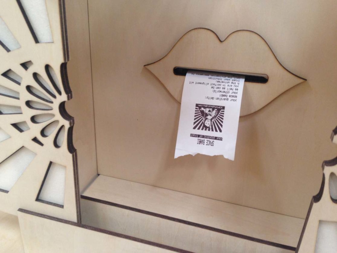 After praying to the Space Bambi deity, the visitor is asked to place the finger on the doorbell button – instead of calling the deity with a bell as commonly done at a shrine. According to the individual data, the spirit of the robot channels the fortune information from the universal consciousness data and delivers it as a receipt. The fortune receipt is the entrance ticket to the Space Bambi Show and the application download image for the exhibition. A divination emergency hotline is included as well. 2016-2018